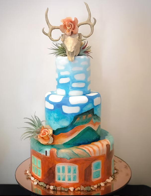 Zara’s cakes are a love letter to New Mexico itself. Her hand-painted masterpieces are delicate, expressive, and imbued with the spirit of the high desert. Think: soft adobe tones, folkloric motifs, blooming cacti, and the hush of a Santa Fe sunset, all rendered in edible watercolor. Zara doesn’t just bake — she paints memories. Her work is at once grounded and ethereal, offering her clients the perfect blend of tradition and dreamscape.