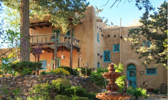 Winter wraps the adobe in snow, glowing with candlelight and charm.
